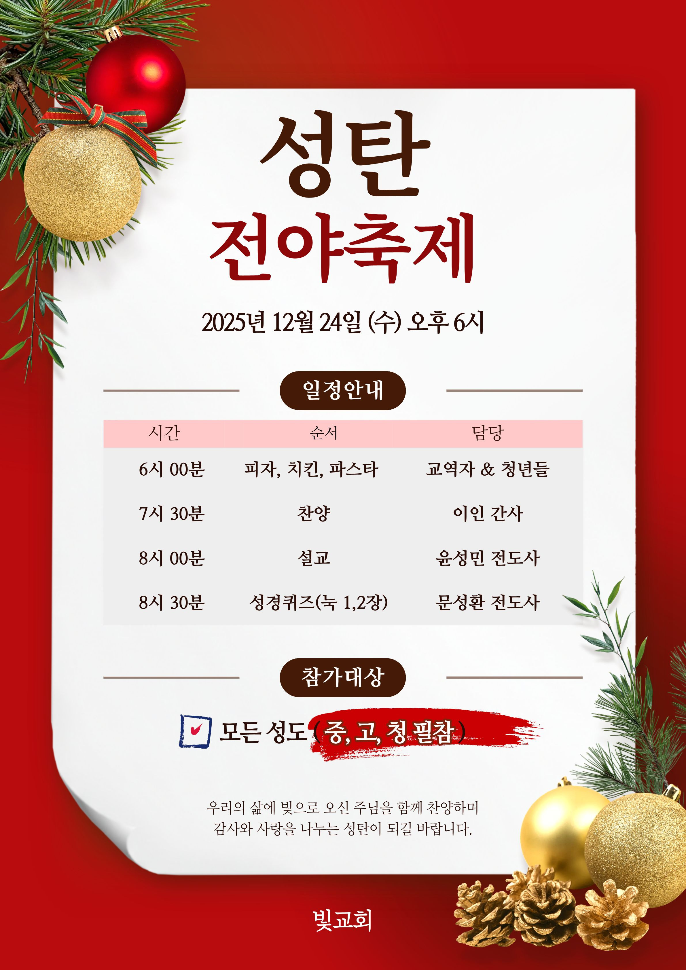 지난 12월 24일, 성탄 전야를 맞아 "각 사람이 이웃을 기쁘게 하되 선을 이루고 덕을 세우도록 할지니라"는 말씀의 의미를 되새기며 온 교우가 함께하는 축제의 시간을 가졌습니다.