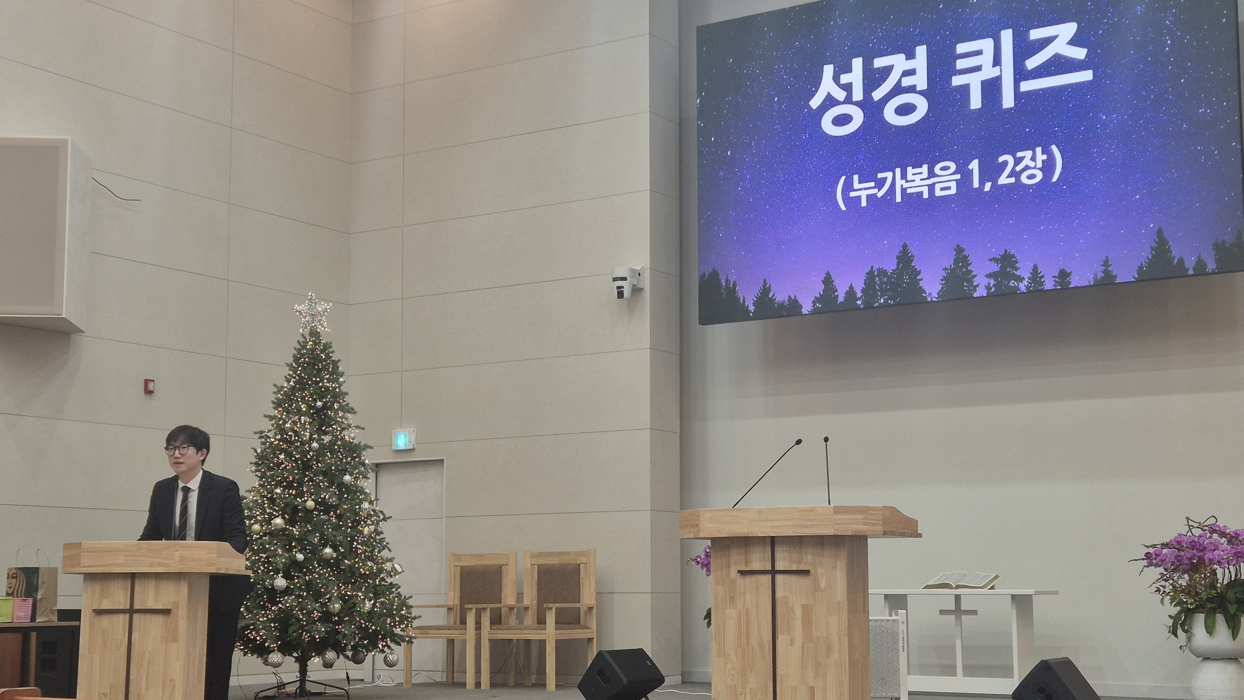 식사 후에는 찬양 예배를 통해 풍성한 은혜를 나누었으며, 마지막 순서로 진행된 성경 퀴즈 시간을 통해 즐거운 화합의 장이 마련되었습니다. 특히 청년부 안가람 자매가 성경 퀴즈 1등을 차지하며 청년부원 모두에게 큰 기쁨과 자랑이 되었습니다. 섬김과 나눔, 그리고 웃음이 가득했던 뜻깊은 성탄 전야였습니다.